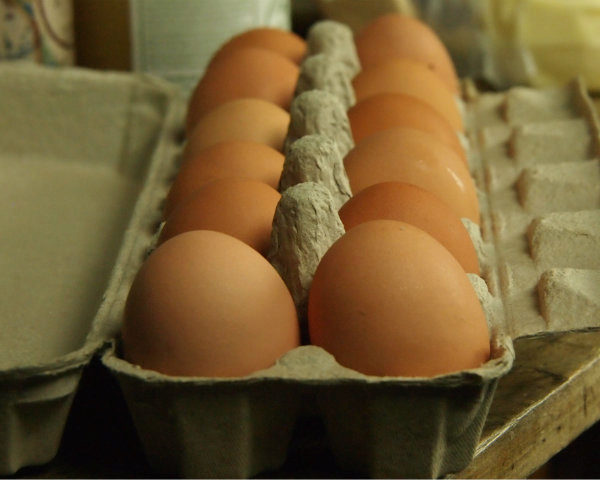 These eggs are laid by hens who spend their days digging and scratching out of doors where they get a very healthy diet of vegetable scraps from the farm and organic grain.